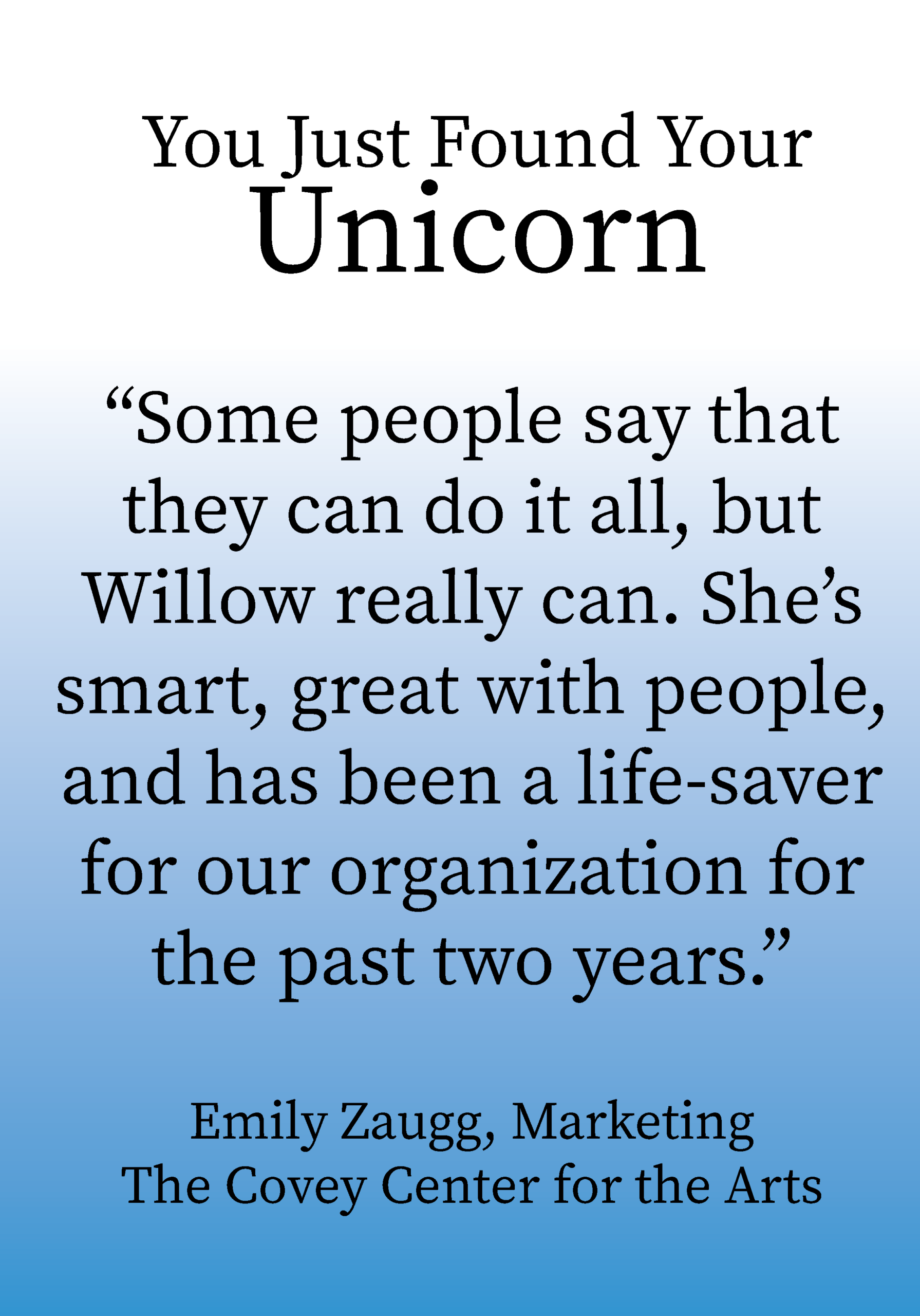 Willow is one of the most versatile employees I’ve ever had. She saved the day more times than I can count, and she’s so good with technology and research.